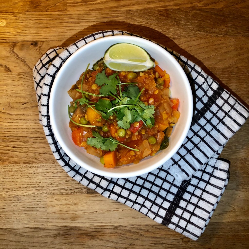You can use pretty much any vegetables for this, but my main bulk veg in this recipe is butternut squash (it also works well with pumpkin.) It adds a nice sweetness to the curry and makes it a hearty dish.
