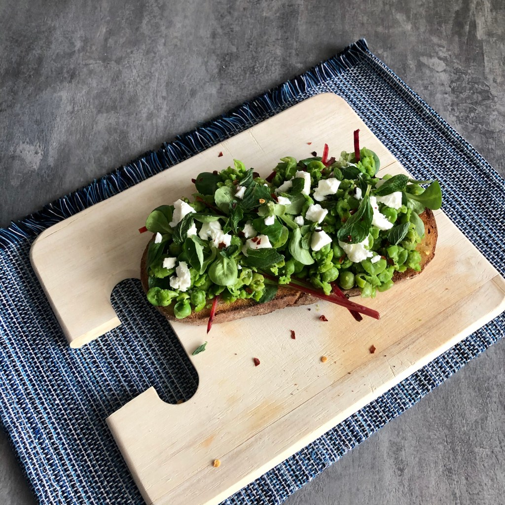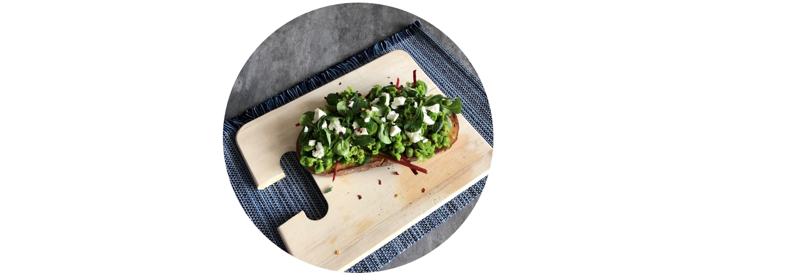 - Arrange the salad on the toast and top with the mashed peas